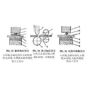 塑料袋装产品的封口方法有结扎、热封、钉封、粘封等,其中以热封封口的方法较简单可靠,应用最广。 热封方法 热封是利用塑料具有热塑性,使封口部位的塑料薄膜加热、加压相互粘合在一起。热封的方式很多,有热板封合、熔断封合、高频封合、超声波封合、电磁感应封合和红外线封合等。 1.热板封合 如图3.24所示, 把加热板加热到一定的温度,将要封合的塑料薄膜紧.......