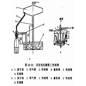 (三)负压灌装(又称真空灌装)它是在低于大气压力的条件下进行灌装,即先建立容器内的真空,然后靠液体的自重或靠液料箱与容器问的压力差进行灌装。可分为单室和双室两种负压灌装方法。 1.单室负压灌装 。贮液箱1内的液面由浮阀2保持一定高度,液面上部空气由真空泵抽走,形成一定的真空度。排气管3的上口要高出液面。当空瓶上升与灌装阀4接触,使瓶密封,并打开气阀,使瓶与贮液箱上部接通,瓶内形成.......