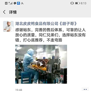 2020年4月14日,湖北皮皮鸭食品有限公司在微信朋友圈公开称赞江南游戏网址 科技有限公司的给袋式真空包装机,目前他们已经有30台裕东的设备。 感谢裕东,完善的售后体系,可靠的让人放心的质量,同仁兄弟们,选择裕东没有错,打心底推荐,不走弯路。裕东已经成为食品包装机械中的艺术品。 降低销售成本,不仅需要过硬的产品质量,而且还需要完善的售后服务体系.......