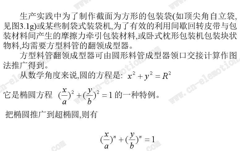 描述: 生产实践中为了制作截面为方形的包装袋(如顶尖角自立袋,见图3.1g)或某些制袋式装袋机,为了有效的利用间歇回转皮带与包装材料间产生的摩擦力牵引包装材料,或卧式枕形包装机包装块状物料,均需要方型料管的翻领成型器。
