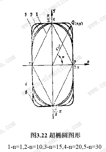 当n逐渐增加到n>20~40时,超椭圆图形就逐渐过渡到带圆角的长方形或正方形如图3.22所示。
