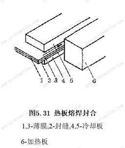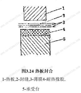 如图3.24所示, 把加热板加热到一定的温度,将要封合的塑料薄膜紧压在一起,这是热封原理与结构最为简单的一种,封合速度较快,可恒温控制,这种方法常应用于封合聚乙烯等复合薄膜,而对受热易收缩与分解的薄膜,如各种热收缩薄膜,聚氯乙烯等不宜应用。