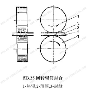 如图3.25所示,将一对反向等速回转辊筒的一方或双方加热,两辊中间通过重合膜进行加压封合,能连续封合是本方法的一大特点,主要适合于复合包装薄膜,因单层薄膜受热易变形会导致封缝外观质量较差而不宜应用。