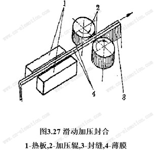 如图3.27所示,薄膜首先通过一对热板中间受到加热(电加热或空气加热),再经一对反向回转辊轮加压封合。本方法结构简单,能适应那些热变形大的薄膜的连续封合。