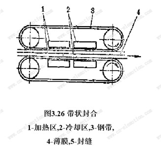 如图3.26所示,一对相向回转的金属带之间,夹着要封合的薄膜直线运动,在前进中通过钢带两侧加热、加压、冷却。本结构稍为复杂,一般用于袋口的最后封口上,即能在运动中封合,以能适应受热易变形的薄膜。