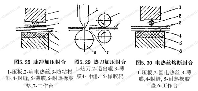 如图3.29和3.30所示,靠加热过的热刀或电热丝与薄膜接触,使薄膜熔断,并得到封口的一种方法,这种封缝的强度不大, 封口的外观独特, 其中图3.29是恒温加热的热刀熔断封口,图5.30是电热丝熔断封合,后者所得封缝强度较好,特别对热收缩薄膜封口较有力