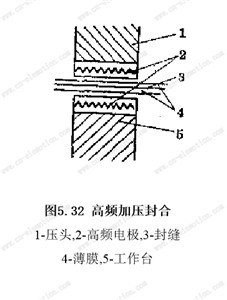 如图5.32所示,薄膜用上、下电极压着,外加高频电源时,聚合物有感应阻抗而发热熔化形成封缝,因是内部加热,中心温度较高而不过热,所得封缝强度较高,对聚氯乙烯很适合,但不适用低阻抗薄膜。