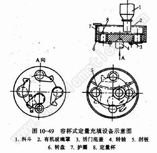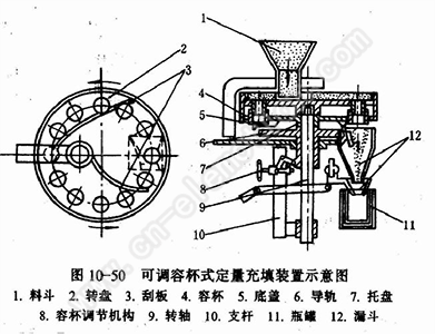 又可分为固定容杯式和可调容杯式,见图10-49。物料由料斗1自由落人定量杯8内,高出定量杯8上平面的多余物料被随转盘转动的刮板5刮掉。转到充填工位时,顶杆打开定量容杯底部的活门。物料便落人容器,完成计量充填工作。