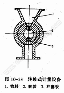 4.转鼓式计量设备 见图I0-53,转鼓2上有两个圆形截面的空腔,通过柱塞板3可以调节容腔的大小,转鼓2被带动旋转,在上部受料,下部充填。