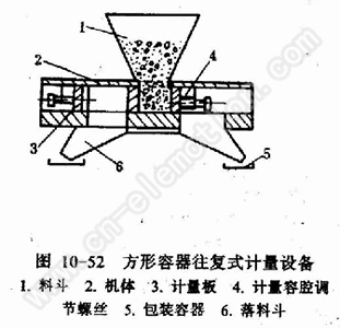 3.方形容器往复式计量设备 见图10-52,它有两个可以调整容积大小并作往复运动的计量腔。当计量腔运动到料仓下方时,物料落人腔内。当计量腔运动到落料斗上方时,向容器充填,两个计量腔轮流受料和充填。