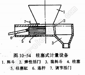 5.柱塞式计量设备 见图10—54,柱塞4由连杆6带动作往复运动,将一定容积的物料推人容器中。