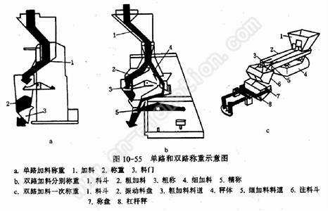 (1)单路称重充填设备,又叫一次加料称重设备见图10-55a所承,利用杠杆秤的原理,一次称重和装料,其计量精度较低,为了提高称重精度,可由单路称重改为双路称重。