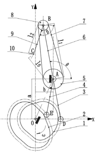 1-凸轮1 2-凸轮2 3、4-摆杆 5-主动链轮 6-大臂 7-链条 8-从动链轮 9-小臂 10-取袋器夹