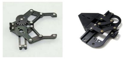给袋式包装机的取袋机构主要有吸附式、机械夹钳式、磁力吸附式和承载式机构等。对于给袋式包装机的包装过程和包材而言,主要应用到的机构类型有:吸盘吸附式机构和机械二指夹持式机构,如下图: