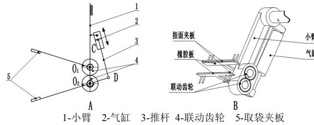 给袋机取袋机械手二指夹持机构(A-机构简图,B-结构视图)