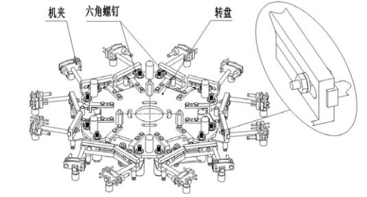给袋式包装机六工位转盘是包装机包装作业过程的主要作业载体,根据工作流程图可知六工位转盘的大致结构,转盘一周 360°,每两个工位之间的夹角为 60°,机夹夹手在转盘上是对称的,图1为其示意图。机夹调整时,松开六角螺钉,机夹可沿左右轨道方向移动,以适用于不同规格的包装袋。