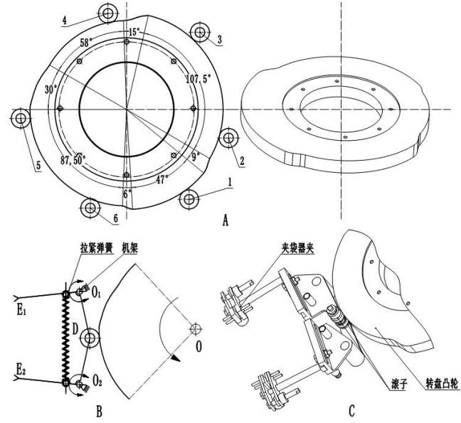 对于第一工位夹袋动作、第三工位开袋动作、第四工位与第五工位之间的袋口闭合动作,我们设计了一种特殊的多运动规律的凸轮轮廓,如上图所示。图中 1~6代表滚子,滚子与转盘凸轮高副配合,构成了摆动滚子连杆盘形凸轮机构。滚子 6 到滚子 1,再到滚子 2,这一区间段表示作业在第一工位,转盘凸轮先逆时针转动,滚子 6 随转盘转至滚子 1 位置,拉紧弹簧拉伸,两夹袋器夹绕机架上O1、O2 点转动,如上图所示,间距变大,即机夹夹手宽度变宽,以便于预制袋的放入,之后滚子 1 到滚子 2 的位置,转盘凸轮顺时针转动,弹簧收缩,机夹夹手宽度变窄,夹持预制袋;滚子 2 到滚子 3 区间表示在第一工位与第二工位之间,机夹夹手宽度不变;滚子 3 到滚子 4 区间表示工作在第三工位,转盘凸轮逆时针转动,机夹宽度变窄,以便于开袋和撑袋;滚子 4 到滚子 5 区间表示工作在第四工位和第五工位之间,转盘凸轮逆时针转动(滚子随六工位转盘转动速度大于转盘凸轮的转动速度),机夹宽度变宽,以便于热封;滚子 5 到滚子 6 区间表示工作在第五、六工位,热封、整形时机夹宽度不变,袋口贴合。以上过程便实现了