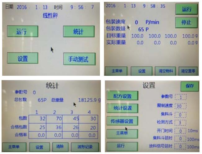 3)电子秤的相关参数设置如图,主界面有“运行”、“统计”、“设置”、“手动测试”四个按键,分别控制电子秤的运动与停止、对包装袋的统计、电子秤机构参数的设置和手动测试。