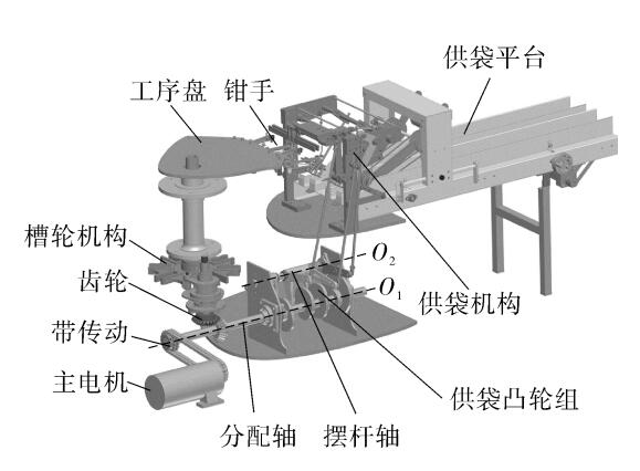 给袋包装机的重要组成,其组成与工作原理如图所示,主要由驱动电机、分配轴、一次上袋机构、二次上袋机构、夹取提升机构、扫袋皮带、送袋皮带、供袋平台和基座等组成。供袋部件的机构分析简化模型如图 3 所示,为清晰表达,各驱动凸轮及相应摆杆机构分开绘制,其轴心分别对应分配轴轴心 O1 和摆杆轴轴心O2。