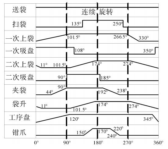综合集中驱动、结构尺寸、控制等多方面因素,给袋式包装机的供袋部件采用凸轮、连杆的复合机构,实现预制包装袋的自动供袋动作,机构模型见图。以给袋式包装机的设计包装速度 50 袋 /min 为例进行供袋机构设计,每个包装袋的自动上袋时间为1.2 s,即以分配轴 O1 为基准轴的供袋机构工作循环时间 tk=1.2 s。根据包装机的生产能力要求,结合给袋式包装机供袋机构的自动供袋工艺,综合考虑各执行机构的运动协调、时间同步和空间不干涉,以及机构运动规律误差、运动副间隙、机构元件加工与装配误差、机构元件运动变形等因素,可分配各供袋动作所需时间与运动循环时间的占比关系,设计供袋机构的工作循环图,如图所示。根据工作循环图,利用相关的机构综合、凸轮设计理论和仿真技术,可完成给袋式包装机供袋机构的尺寸优化与结构设计。