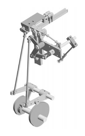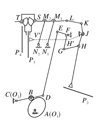 给袋式包装机的二次上袋机构是供袋部件的关键机构,真空吸盘 V 安装在摇杆 HJ 末端,夹持器的驱动齿轮安装在平动杆 M1M2 上,如图 5 所示,其性能直接影响包装机的包装速度与包装精度。分配轴上的主动凸轮 A 连续回转,驱动摇杆JHV 摆动到JHV位置,真空吸盘 V吸取包装袋,从 P2 位置移动到 P3 位置;夹持器夹取包装袋,将包装袋从 P3 位置平移到 P4 位置;工序盘钳手夹持包装袋,间歇移送到下一个包装工位。