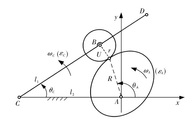 对基于凸轮驱动的摆杆机构 ABCD,可通过高副转化低副的方式 AUBC,将机构转化为双摇杆机构,如图1所示,进而分析机构 ABCD 的性能。