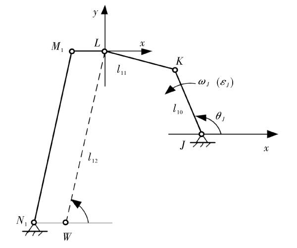 对基于平行四边形机构 M1N1-M2N2 的复合机构 JKLM1M2,可基于平行四边形机构的特点,将机构简化为双摇杆机构 JKLW,如图2所示,研究杆件的输入转角θJ 与铰链点 L 的位置、速度的关系。