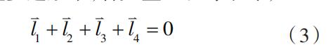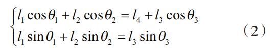 以给袋式包装机双摇杆机构 FGHJ 为例,采用矢量法建立的机构数学分析模型如图1所示,各矢量杆形成封闭的矢量多边形 FGHJF,构件 FG、GH、HJ、JF 对应的杆长、方位角、矢量杆分别为 li、θi 和li→(i=1,2,3,4)。