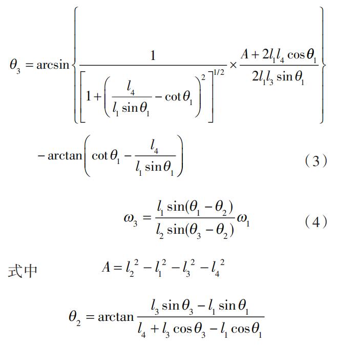 对上式进行推导、整理,可求得摇杆 HJ 的输出转角θ3、输出转速ω3 与摇杆 FG 的输入转角θ1、输入转速ω1之间的数学关系: