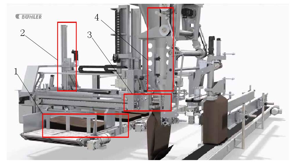 瑞士布勒公司研发的新型MWPG全自动包装机,如图所示,能够自动完成取袋、套袋、填充、封口等一-系列工作(。主要由袋库、取袋装置、套袋装置、落料装置、封口装置等组成。该包装机的袋库是一个移动供袋系统,可以在该供袋系统上同时码放若干摞预制袋,当其中-摞预制袋用完时,传送系统可以自动的把下一摞预制袋运动到取袋工位等待取袋装置取袋。该包装机的包装工艺流程为:预制袋被取袋装置从移动袋库中取出并被放置在预制袋暂存工位,在暂存工位套袋装置可以自动调整可能有少量偏斜的袋口方向使袋口对正,然后利用吸盘吸住预制袋的上下两侧,带着预制袋移出暂存工位,并旋转90°使袋口方向朝上。袋上下两侧吸盘把袋口打开,并向上运动将预制袋套到落料装置的落料口上,落料完成后预制袋被移动到传送带上,传送到封口工位进行封口。