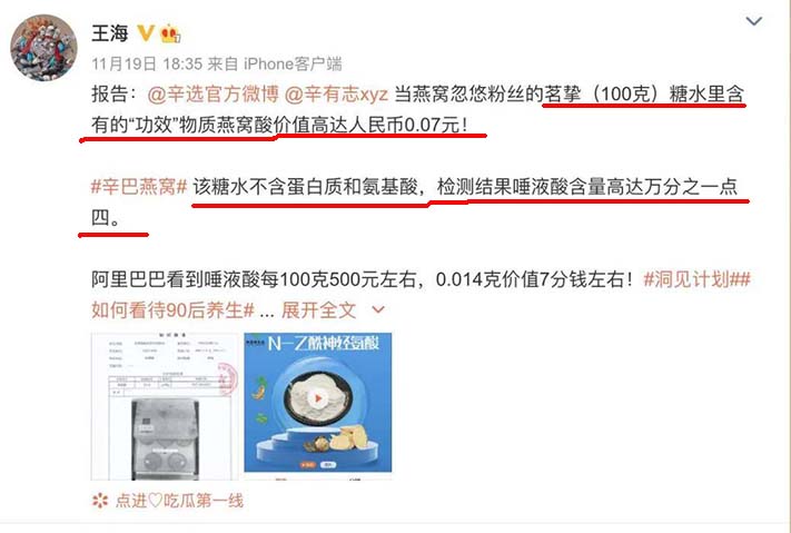 刚开始,我还以为“辛巴事件”只是生活中普通的不能再普通的小新闻,但是随着以辛巴、燕窝为关键词的热搜,频繁登上抖音、新浪微博、百度风云榜等热搜,我才发现这事可能没我想象中的那么简单。于是,我去网络相关媒体了解了一下,大致事情经过是这样的:在辛巴公司辛选旗下的主播辛有志,在推广和售卖一款即食燕窝近十天后,一位自称产品消费者的dy用户在dy平台发布了一个质疑该产品全是水、没有内容物的视频,随后此事被迅速推上抖音热点。后来,职业打假人王海发布了一份检测报告,称辛选燕窝就是糖水,微博话题#辛巴所售燕窝被王海检测为糖水#登上热搜。11月27日,辛巴承认所售燕窝产品存在问题并提出替品牌方先行赔付方案,截至12月6日中午已向27270名消费者完成近2400万元的赔付。