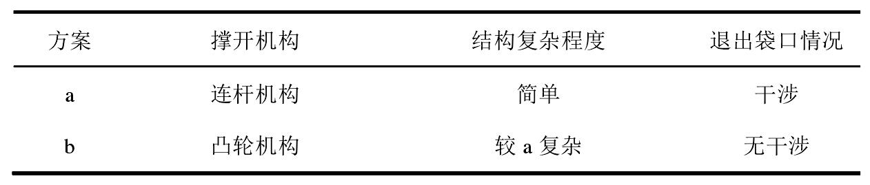 给袋式包装机套袋装置方案的选择。两种套袋方案的区别在于撑开机构的不同,方案(a)、 (b)的撑袋装置分别为连杆机构和凸轮摆杆机构,如图 (a)、 (b)所示。两种撑开机构方案比较如表3所示,方案(a)中连杆机构的设计以及实现都很简单,但是当撑袋板从袋口退出时,需要两撑袋杆向内合拢一段距离,由于两气缸行程无法做到精确的控制,撑袋杆退出袋口时会与充填装置的撑袋板碰撞接触,然后剐蹭着充填装置从预制袋口退出,即有干涉发生。长此以往,不仅会在包装过程中产生噪声,而且撑袋气缸很容易损坏,导致整机频繁出现故障。相对于方案(a),方案(b) 则采用凸轮机构,当退袋时,经设计的凸轮可以保证撑袋杆既向内合拢一段距离又不会与充填装置发生碰撞,从而非常顺畅的实现退袋动作。此外,方案(b)两凸轮机构由电机经一条同步带传动驱动,保证了两凸轮运动的同步性,从而保证两摆杆能够同时开合,避免了由于摆杆不同步导致退袋不畅的问题。综上分析,选择方案(b)作为套袋装置的撑开机构。