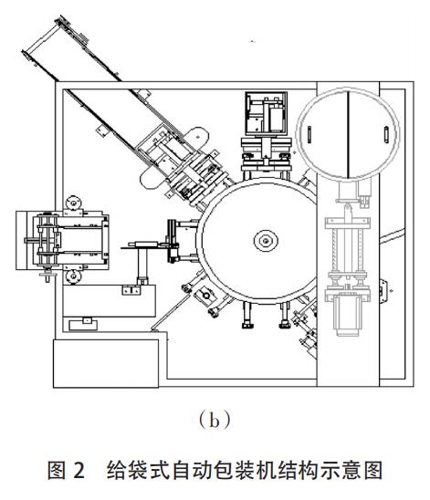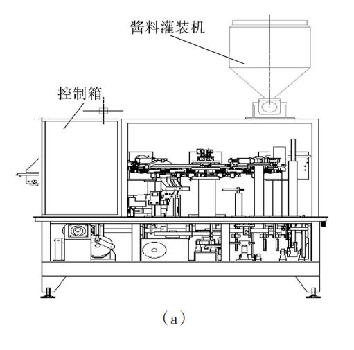 给袋式真空包装机结构示意图,本次选型采用8工位给袋式真空包装机(传统的为6工位)。该机有设计2个注料填充工位,可实现酱液混合物灌装、酱液分离分别灌装,并改进为专用注料枪,控制灌装过程中注料枪本身的漏油及注料枪底部的滴油滴料现象,使包装袋在封口前袋口干净整洁,保证封口时袋口不夹料、不含杂质;给袋式自动包装机采用预制袋包装,增加2个封口工位,一次热封口,一次热封口冷却,主要作用是对封口进行加固、成型,弥补只有一次热封口时如没有封好就造成直接漏油、封口皱褶等现象。