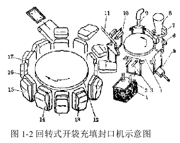1-贮袋库; 2-取袋吸嘴; 3-供袋吸头; 4-充填转盘; 5-打印器; 6-夹袋手;7-开袋吸头;8-加料管; 9-加液管; 10-预封 器;111-送袋机械手; 12-真 空密封转盘;13-第一级真空室; 14-第二级真空室; 15-热封室; 16、17-冷却室