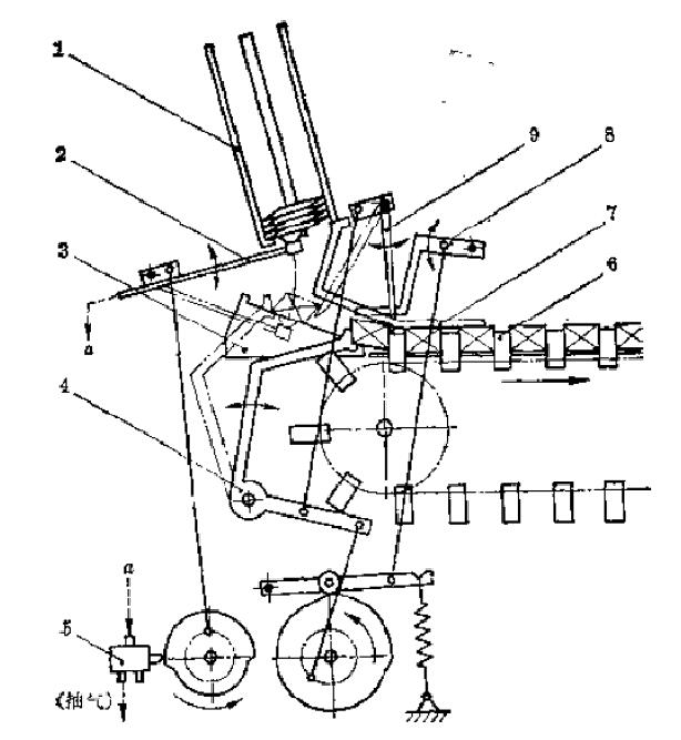 1-片材库; 2-吸盘摆杆; 3-固定斜板; 4-推盒杆; 5-真空换向阀; 6-主传送开盒链板; 7-开盒导向板; 8-压盒摆杆; 9-接 盒摆杆