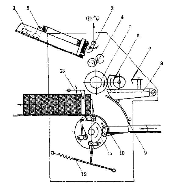 1-片材库; 2-配重; 3- 摆动吸盘; 4输送轮; 5-真空吸鼓; 6- 涂胶轮; 7-刮胶板;8-胶水库; 9-折纸板; 10-接包片轮; 11-调整板; 12-缓冲板; 13-摆动折叠角