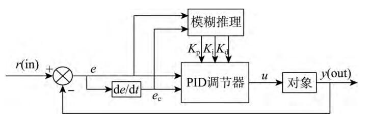 采用最基本的二维模糊控制结构,因为其结构简单、应用广泛,所以最具有代表性,适用于复杂系统。模糊自适应 PID 控制器以 e 和 ec 作为输入,其中 e,ec 分别为每次称量的实际量与设定值的偏差以及偏差变化率,利用模糊控制规则在线对 PID 参数进行修