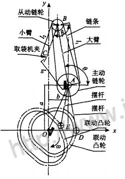 给袋式包装机取袋机构是由 2 自由度 的平面连杆开式链机构和联动凸轮机构组成的封闭型组合机构 ,末端执行器选择机械二指夹持式机构。给袋式真空包装机取袋机械手机构简图见图 。其中大臂臂长为 ,,小臂臂长为 12,取袋末端执行器 C点到回转中心 的距离为 /o, 与 分别为大、小臂与 轴所夹夹角。在取袋机构中联动凸轮作为原动件,取袋机构在联动凸轮的作用下推动摆杆带动链轮机构运动 ,其 中小臂与从动链轮、主动链轮与摆杆固连在一起 ,链轮转动实现小臂杆的摆动 ,这样使得末端机械手实现取送袋运动。凸轮旋转 1个周期 ,机械手重新取袋 ,循环作业 。