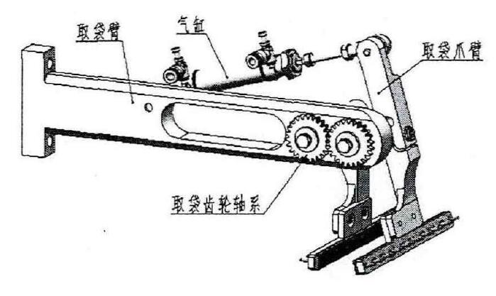 给袋式包装机上接袋装置主要是由取袋臂、取袋齿轮轴系、取袋爪臂、气缸等组成,其主要功用是保证设备给袋工作的实现。