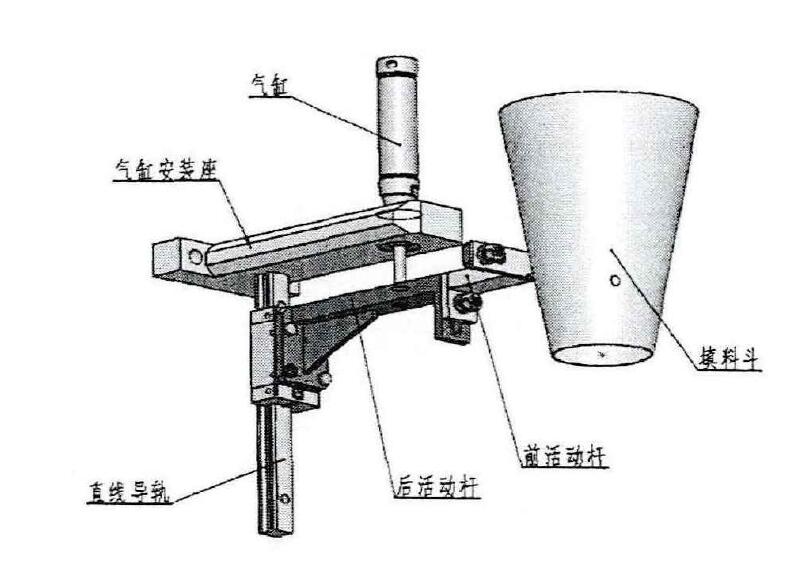 如图所示,填料装置主要由气缸安装座、气缸、直线导轨、后活动杆、前活动杆和填料斗等组成,其主要功用是在设备工作中,实现填料进给。