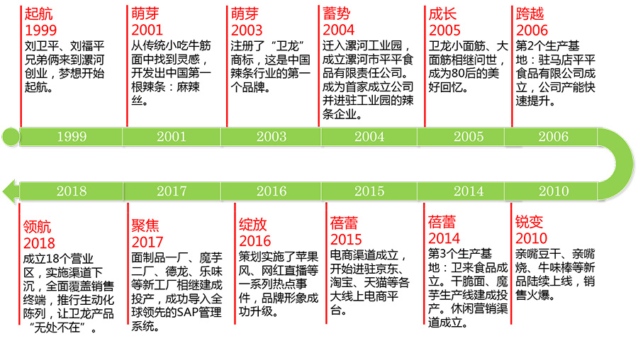 卫龙创办于1999年,是集研发、生产、加工和销售为一体的现代化休闲食品品牌。