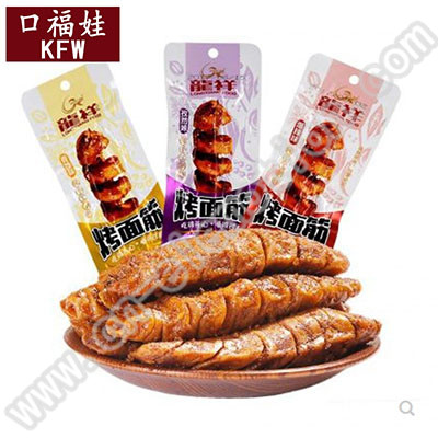 4.将串好面筋的竹签或筷子置于炭火上或烤箱内进行烘烤,并在上面撒上辣椒粉、孜然粉等佐料,烤至金黄即可食用。